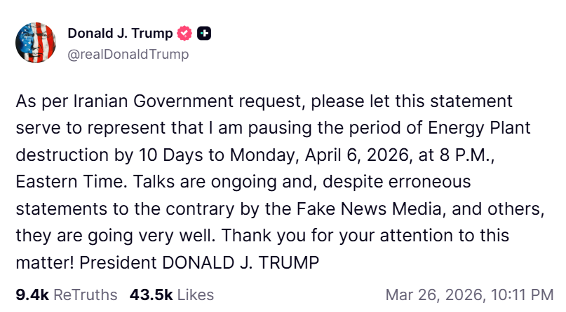 周四,美国总统唐纳德·特朗普宣布将伊朗能源基础设施停火期延长10天至4月6日,理由是相关谈判正在“建设性推进”。