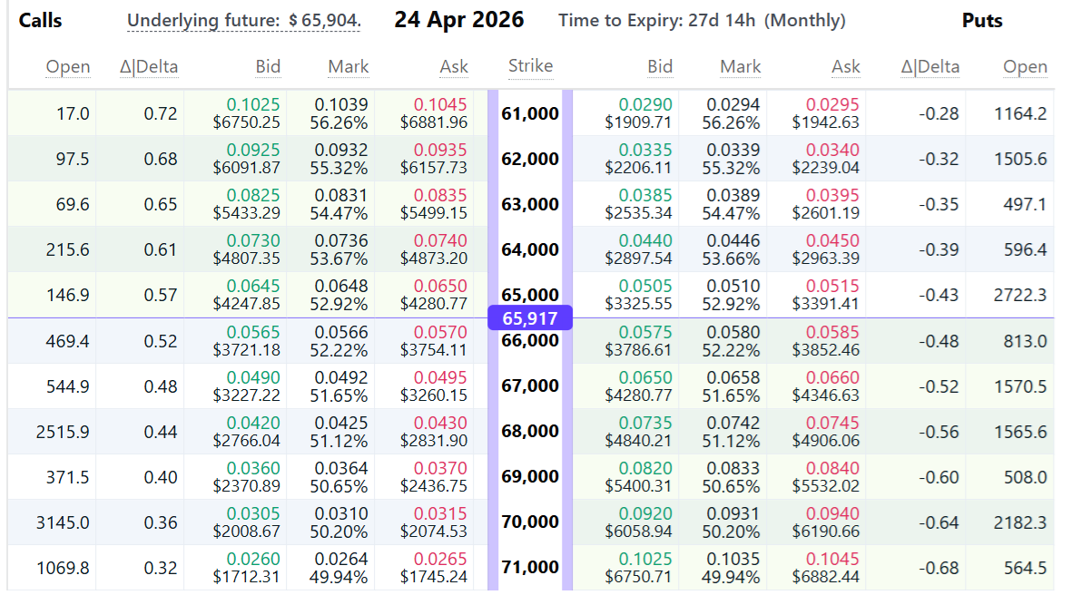 数据显示,截至4月24日,比特币价格维持在66,000美元下方的概率已达53%。与此同时,美国与伊朗-以色列冲突的不确定性持续发酵,促使交易员加速进入风险规避模式。