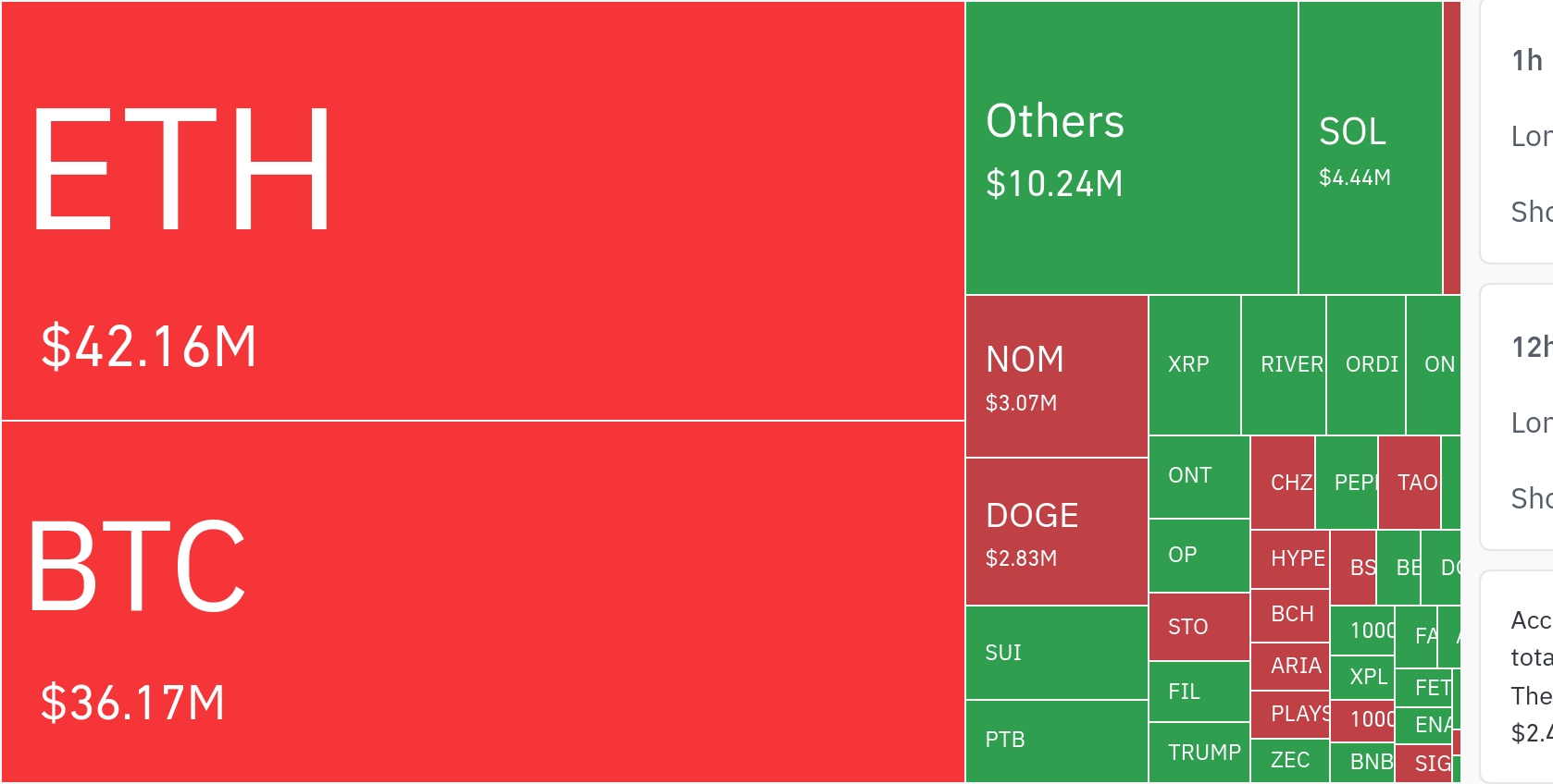 从清算金额分布看,以太坊(ETH)占据首位,单日清算额达4216万美元;比特币(BTC)紧随其后,清算规模为3617万美元。其余各类山寨币合计清算1024万美元,其中Solana(SOL)贡献444万美元,NOM清算307万美元,狗狗币(DOGE)则录得283万美元。