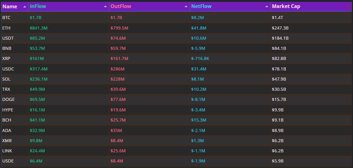 据30日监测数据,过去24小时内,比特币录得约820万美元净流入,以太坊则实现4180万美元的资金净流入,成为市场中最受青睐的资产。稳定币USDC亦有3140万美元资金涌入,反映出投资者对高流动性资产的持续偏好。此外,SOL与TRX分别录得810万和1020万美元的净流入,表明主要加密资产的买方力量正逐步恢复。