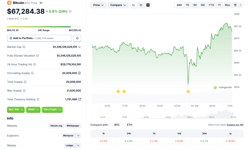 比特币当前成交价略低于67,404.87美元,过去一日微幅走强,流通供应量已接近2000万枚的理论上限。尽管流动性状况有所改善,且价格出现回升迹象,但基本面支撑仍显薄弱,导致市场评论普遍呈现矛盾立场。