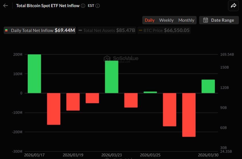 最新数据显示,截至3月30日(当地时间),美国比特币现货ETF市场实现单日净流入6944万美元。此前连续两个交易日分别录得1亿7122万美元与2亿2548万美元的资金外流,市场情绪出现明显修复,短期资金流动趋势转向积极。目前,整体累计净流入已攀升至560亿美元。