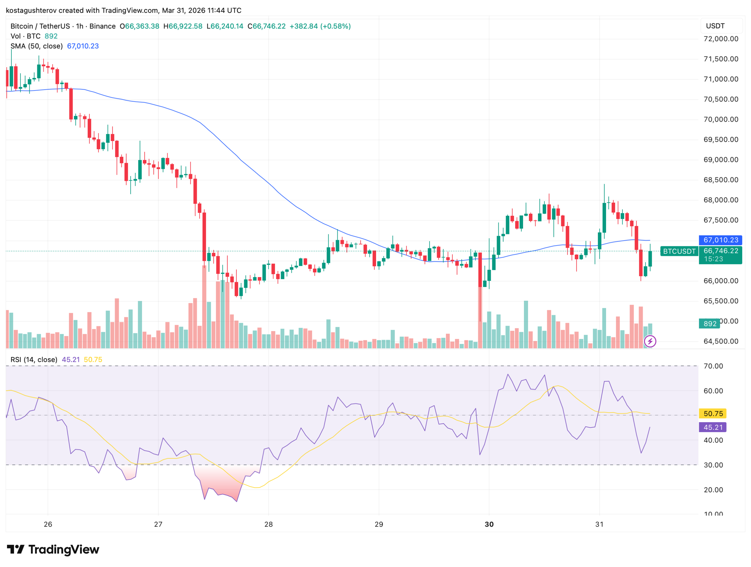 TradingView一小时图表显示,比特币于3月26日在71,000美元上方开盘,次日大幅下挫至65,000美元附近低点,相对强弱指数一度逼近20。此后价格反弹,于3月30日回升至68,500美元,但在3月31日再度回落,最低触及66,000美元,最终收于66,746美元。50周期简单移动平均线位于67,010美元,高于当前价格,且在数周下跌后趋于走平。RSI读数为45.21,其平滑信号线为50.75,表明指标处于中性偏弱区域,低于自身均线。整周走势模式比单一指标更具说服力:每次反弹均在触及移动平均线前被抛售,而衍生品市场正是这一卖压的主要来源。