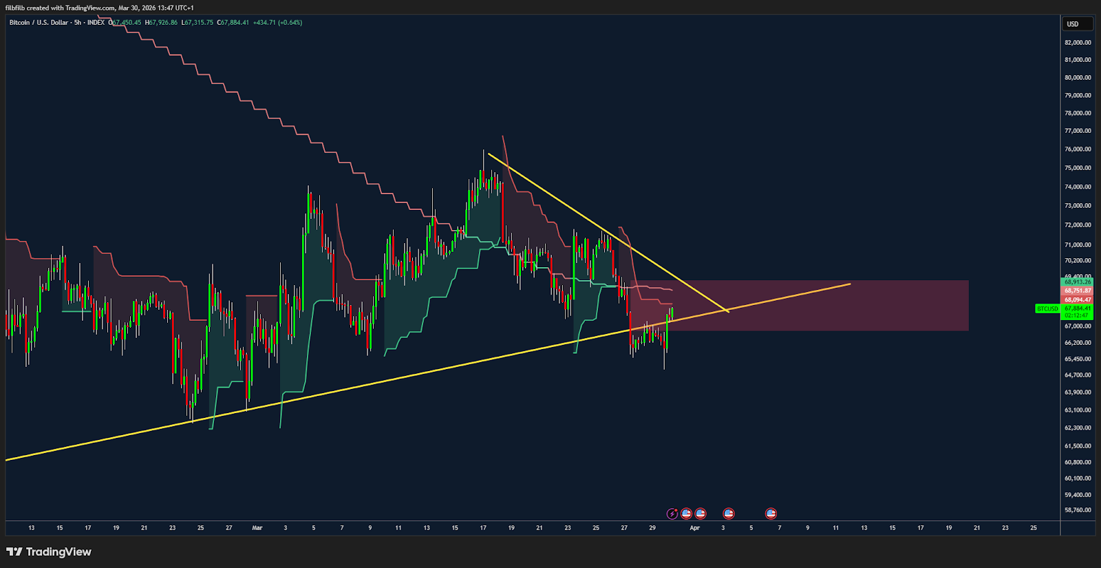 独立分析师filbfilb于周一通过即时通讯平台指出:‘当前整体趋势依然偏向下行,但50日移动平均线与斜向压力区位具备良好支撑作用。一旦价格有效突破该区域,可能触发看跌情绪逆转。’他进一步强调,目前比特币正回调至前期支撑位——即50日均线附近,该均值现运行于68.8千美元水平,其守卫与否将成为短期方向指引。