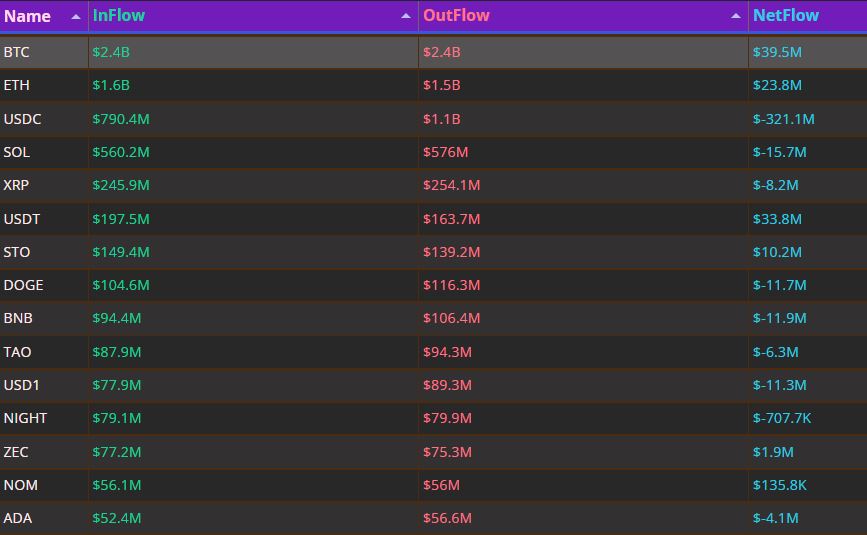 反观资金外流方面,USD Coin遭遇约3.211亿美元净流出,成为最大资金撤离点。此外,Solana、BNB、狗狗币及USD1分别录得1570万、1190万、1170万和1130万美元净流出,显示部分新兴资产面临阶段性抛压。