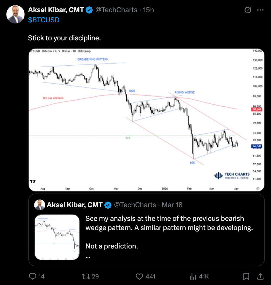 特许市场分析师阿克塞尔·基巴尔预测,若跌破形态下沿,可能引发价格进一步下探至52,500美元区域。其3月18日报告强调:“跌破关键支撑将释放下行动能,目标指向52,500美元。”