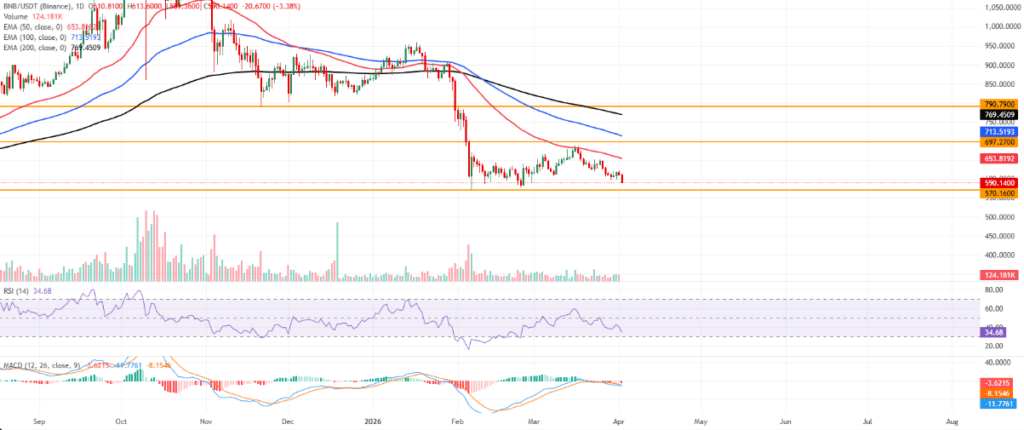 目前BNB价格稳定在590美元附近,仍处于50日、100日及200日指数移动均线下方。这些长期均线呈上行趋势,形成有效阻力,叠加多次反弹失败,卖盘压力始终存在。同时,相对强弱指数徘徊于30中段,动量指标未见反转信号。