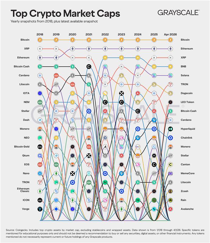 摘要:根据灰度最新发布的市值排名对比,2018至2026年间加密市场主导权经历深刻重构。传统支付型代币衰落,智能合约平台、交易所生态币与模因资产崛起,反映出市场对应用场景、流动性与社区影响力的重新评估。