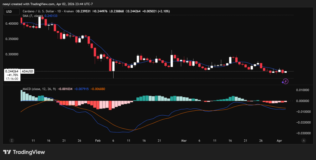 过去一个月,卡尔达诺在0.24至0.29美元区间内缓慢下行,初期短暂冲高至0.29美元后逐步回落,目前稳定于0.244美元附近。近七日走势显示,价格从0.27美元跌至0.24美元后出现短暂回升,但未能延续,再度回探低点,凸显每次反弹均遭遇有效抛售。