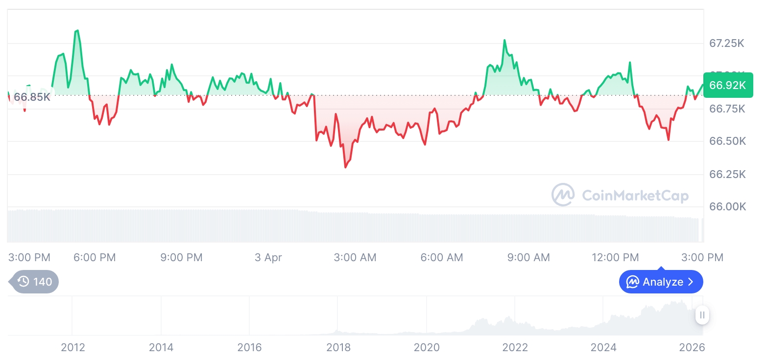 摘要:比特币报价小幅上扬至66,943美元,以太坊微跌;山寨币表现分化,去中心化金融与稳定币交易量显著下滑,市场波动性持续引发关注。
