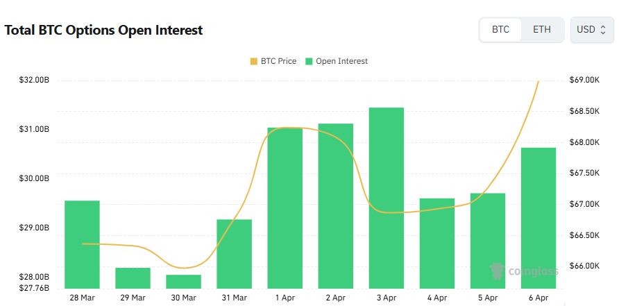 24小时内交易最为活跃的合约依次为:38万美元看涨期权(6月26日·Deribit)、6.7万美元看跌期权(4月24日·Deribit)及6.85万美元看涨期权(4月6日·Bybit)。其中,6月到期的38万看涨期权成为市场焦点,凸显对短期内价格突破的预期。