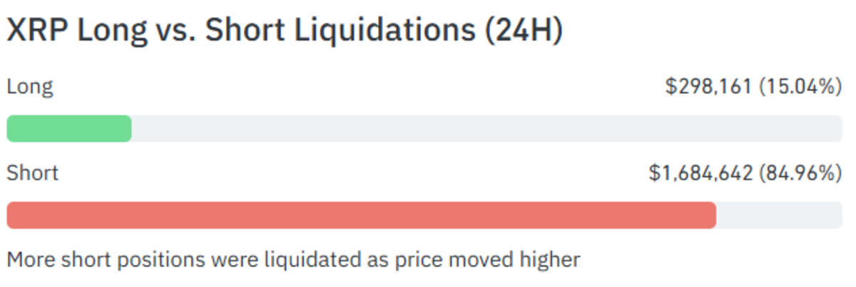 值得注意的是,过去24小时内XRP逆势上涨2.6%,带动部分空头仓位被强制平仓。数据显示,该时段内空头清算金额达168万美元,多头则清算29.8万美元,显示短期市场情绪有所回暖。