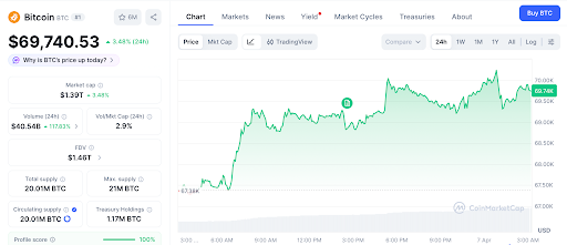 4月6日,Circle正式公布其Arc Layer-1区块链的抗量子技术路线图,成为首家在主网上线即部署后量子签名机制的主流稳定币发行方。此举标志着行业对量子计算威胁的前瞻性应对进入新阶段。同日,比特币价格攀升3.48%,触及69,740美元,单日市值增长700亿美元,总市值突破2.45万亿美元,创下11天以来新高,多头动能显著释放。