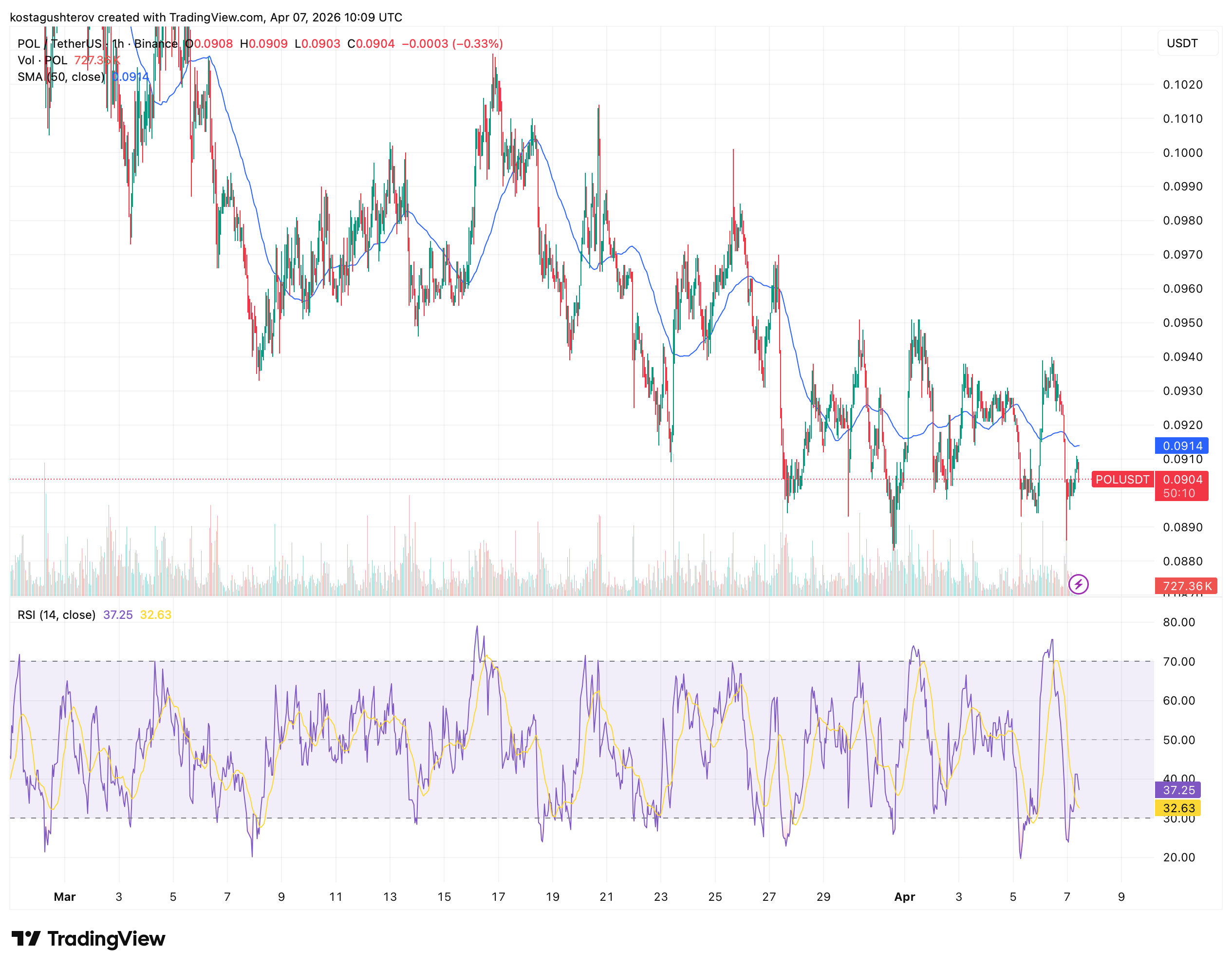 节点运营商需在激活前完成Bor v2.0或Erigon v3.5.0版本升级,普通用户无需操作。这些改进直接缓解了高频DeFi应用长期面临的关键摩擦点。然而,市场尚未反映这一进展——POL自3月初以来持续走弱,从0.102美元跌至0.0904美元,相对强弱指数32.63接近超卖,50日均线构成上方阻力。