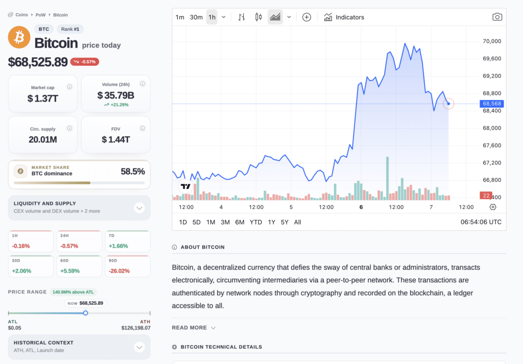 当前比特币价格稳定在68,482.43美元附近,24小时交易量高达357.58亿美元,市值突破1.37万亿美元,持续吸引市场关注。尽管屡次试探70,000美元关键阻力,但整体走势呈现出看涨意愿与外部风险并存的复杂格局。