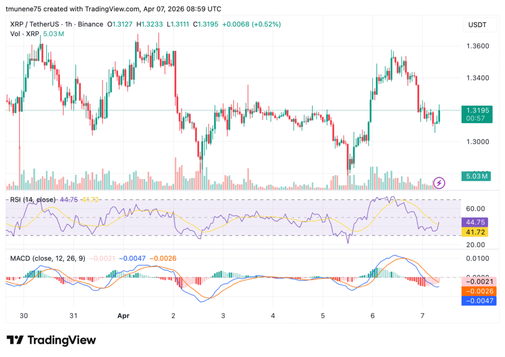 XRP在4月初经历剧烈抛售后进入横向震荡阶段,目前价格稳定于1.33美元上下。1.34至1.35美元区间构成明显上行压制,而1.30美元区域成为买方主要防线。技术指标如RSI接近44点,显示中性偏空;MACD仍位于零轴下方,暗示下行动能未完全消散。