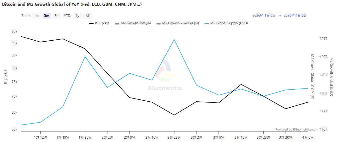 截至4月6日,全球广义货币供应量(M2)达118.3587万亿美元,较前一周微增0.07%,延续小幅扩张态势。然而,近七周平均增长率录得-0.38%,虽较前一周的-0.77%有所收窄,但仍显示短期流动性收缩压力未消。