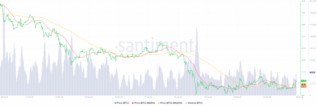 去年11月下旬,50日移动均线下穿200日均线,触发死亡交叉,成为加速抛售的重要信号。随后价格一度下探至6.2万美元区域。