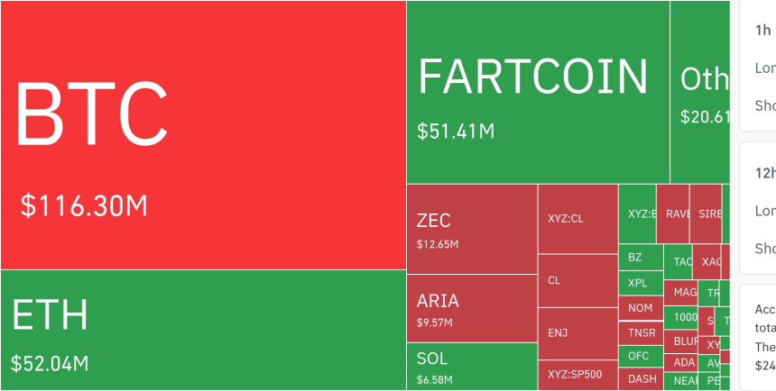 从币种维度看,比特币相关合约清算总额最高,达1.163亿美元。以太坊合约在相同周期内被清算约5204万美元。此外,部分高波动性山寨币及ZEC亦出现显著清算金额。尽管狗狗币价格微涨0.52%,但其清算规模仍达到约6730万美元,反映出市场情绪高度分化。