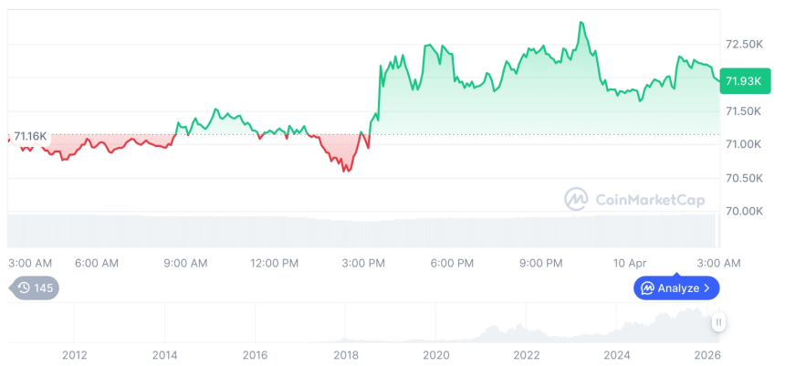 最新数据显示,比特币当前交易价为71,961美元,较前一日上涨1.30%;以太坊报价达2,188美元,环比微增0.34%,整体呈现温和反弹态势。