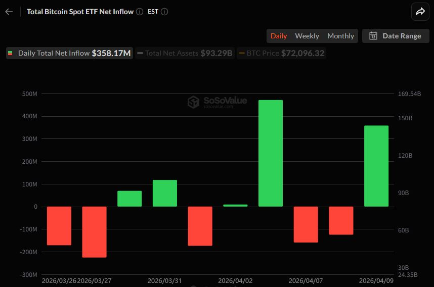 美国比特币现货ETF市场在经历连续两个交易日的资金外流后,于4月9日(当地时间)重新实现资金净流入,当日净流入金额达3.433亿美元,反映出市场信心逐步恢复。