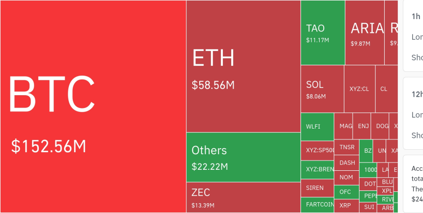 从币种维度看,比特币相关仓位的清算规模位居首位。24小时内清算额约为1.5256亿美元,其中4小时内的最大单时段清算额为6490万美元。