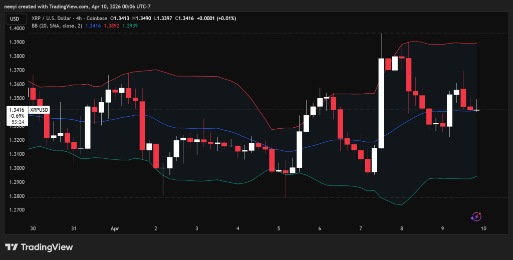 支撑区间稳固于1.32美元,上方阻力则设于1.369美元。布林带显示,日线级别价格未能突破上轨后回落至中轨,而4小时图亦呈现类似格局:价格自上轨回撤后,在中轨处获得暂时支撑。若该水平能持续维稳,上行动能有望重启,目标指向1.39美元。