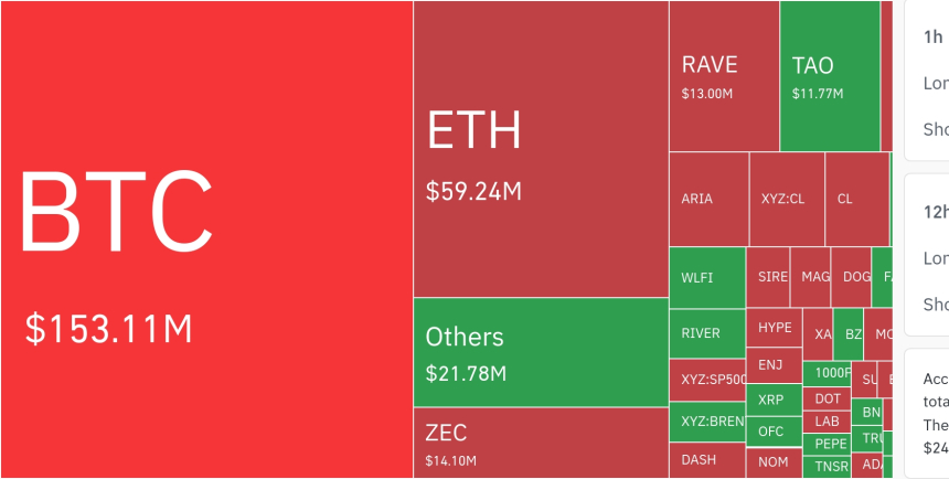 从币种维度看,比特币相关头寸成为清算主力,24小时清算总额约为1.531亿美元,4小时峰值达15.31万美元。