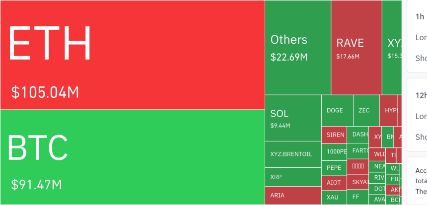 在24小时周期内,与比特币相关的杠杆持仓清算总额约为2.1949亿美元,以4小时为单位计算,单时段最高清算额曾触及832万美元,成为本轮行情中的最大风险源。