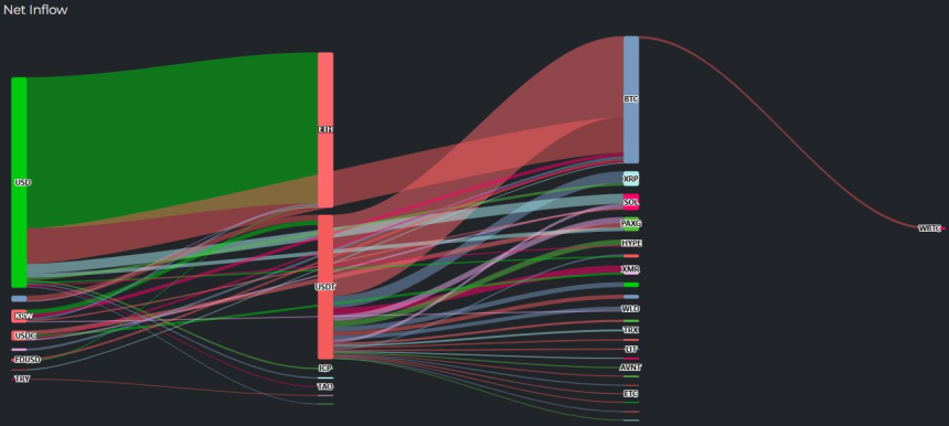 与此同时,以太坊(638万美元)、RAY(104万美元)及USDC(626万美元)成为资金流出的主要标的,反映特定项目或资产面临阶段性抛售压力。比特币虽有288万美元净流入,但其配套稳定币泰达币亦迎来464万美元资金注入,法定货币层面则出现849万美元美元与144万美元韩元的现金化流出。