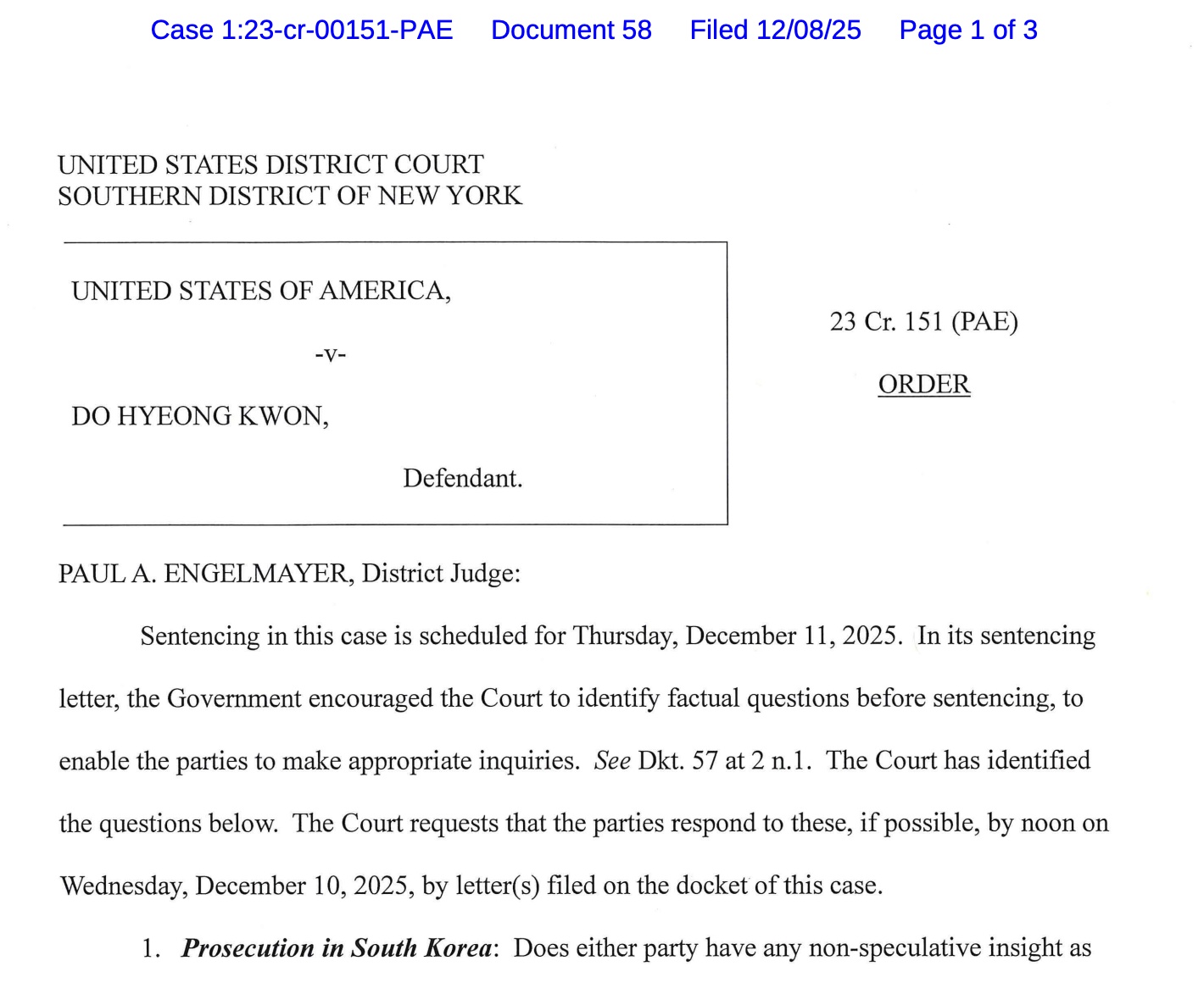 周一,纽约南区地方法院法官保罗·恩格尔迈耶向权的律师和代表美国政府的律师询问了这位Terraform联合创始人可能在韩国面临的指控以及“最高和最低刑期”。预计权在美国服刑后将被引渡回韩国。