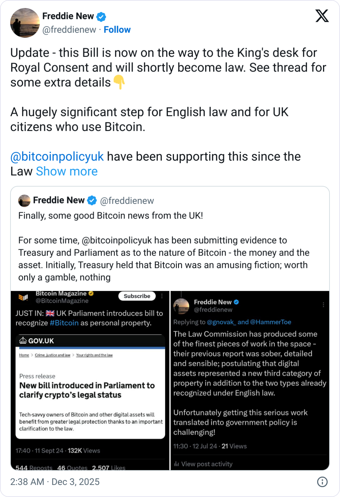 倡导组织Bitcoin Policy UK的政策主管Freddie New在X上表示,该法案“成为法律对于英国的比特币以及所有在英国持有和使用比特币的人来说,都是向前迈出的一大步”。