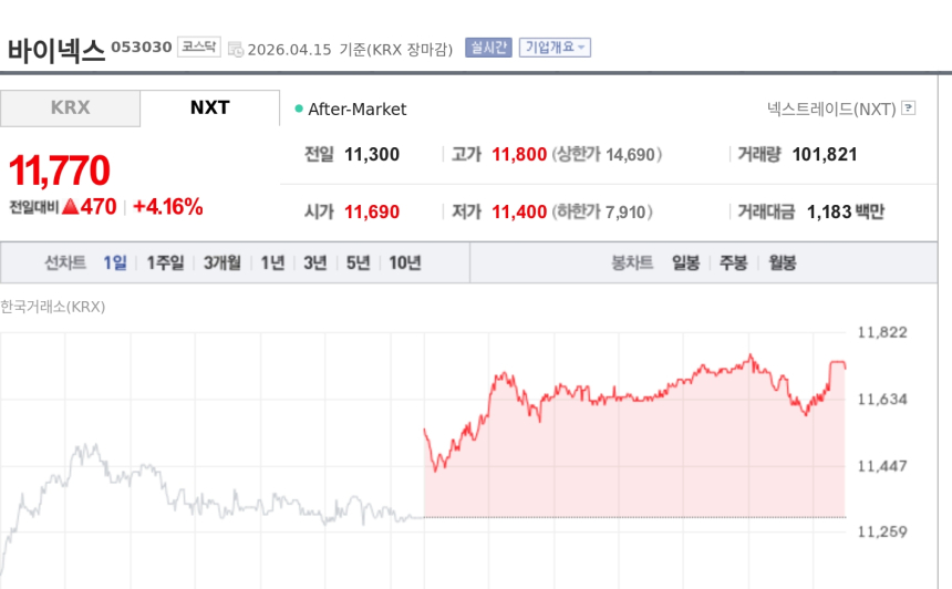 截至最新交易日,该公司股价报收于11,770韩元,较前一交易日上涨470韩元,涨幅达4.16%。