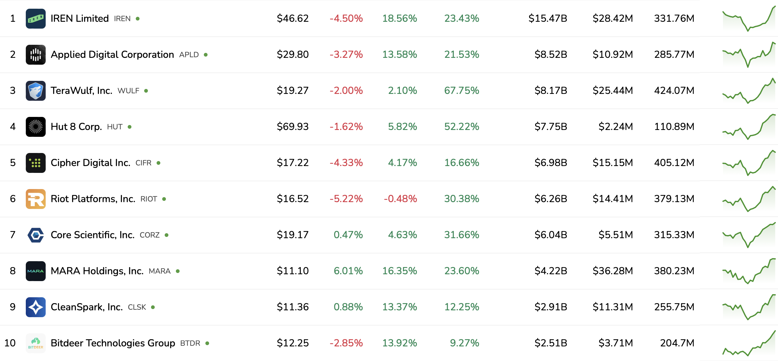 当前,多家公开上市的比特币矿企正积极拓展至高性能计算与人工智能工作负载领域。MARA Holdings、Riot Platforms、Bitdeer Technologies、TeraWulf、Hut 8、CleanSpark及IREN均依托现有电力资源与数据中心设施,切入AI与云计算市场。