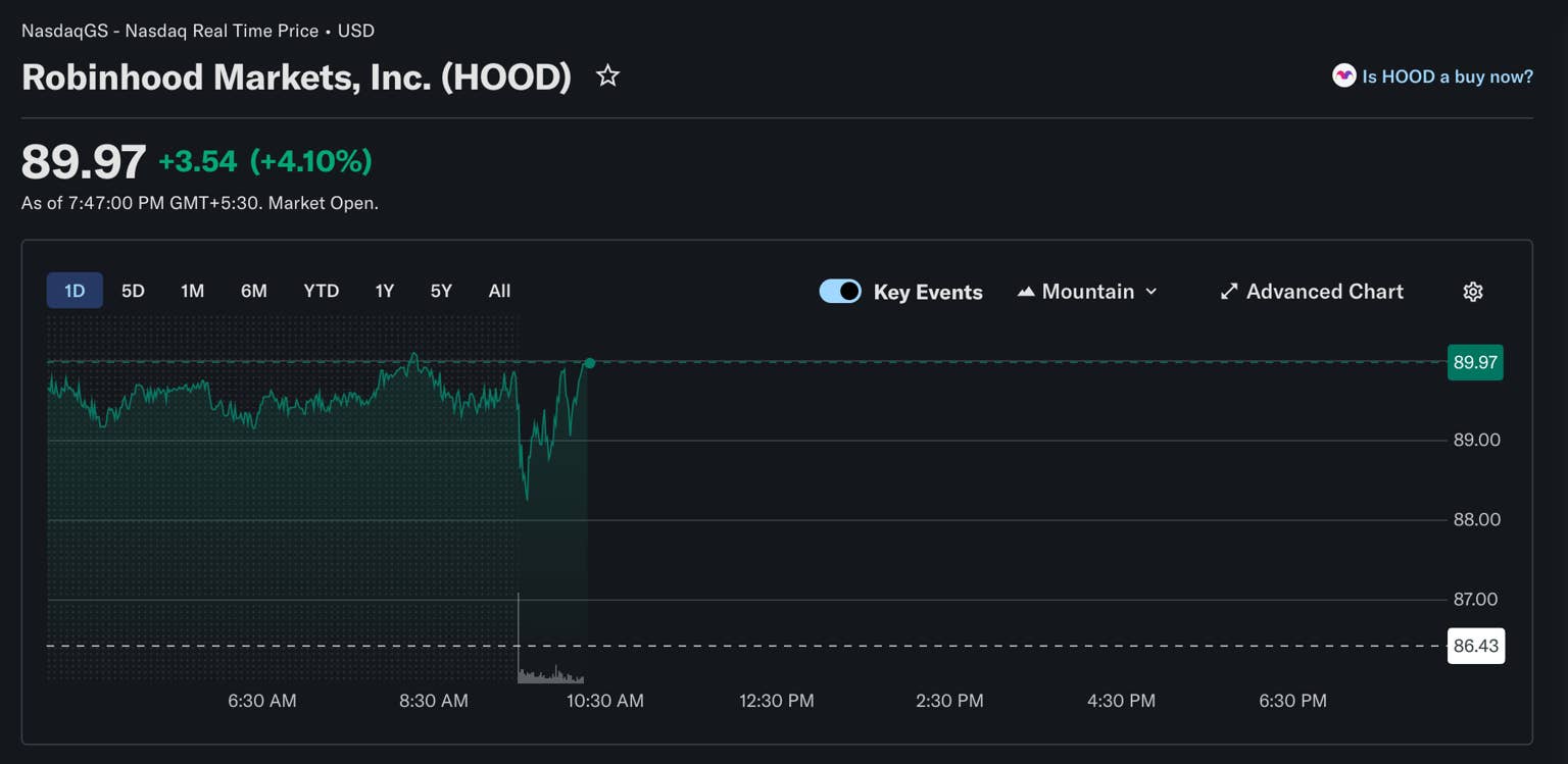 消息公布后,罗宾汉母公司HOOD股价迅速反弹,盘前最高涨幅达4%,开盘后升至89.97美元,较前一交易日86.43美元的收盘价回升逾4%。这一走势受到方舟投资创始人凯西·伍德的高度关注,她管理的ARKK、ARKW及ARKF三只ETF均将HOOD列为重要持仓,权重分别达5.10%、5.22%和4.85%。方舟投资已于4月16日增持60,266股HOOD,价值约260万美元。