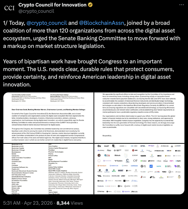 此次联名信已获包括Coinbase、Kraken在内的近120家机构签署,涵盖交易所、行业协会及地方政策研究单位,如得州区块链委员会与Solana政策研究院。值得注意的是,该行动紧随数字商会三天前提出“尽早安排审议”的呼吁,显示行业内部推动立法的紧迫性。信件特别强调:“第119届国会任期已过半,自法案在众议院通过已逾270天,立法窗口正在迅速缩小。”