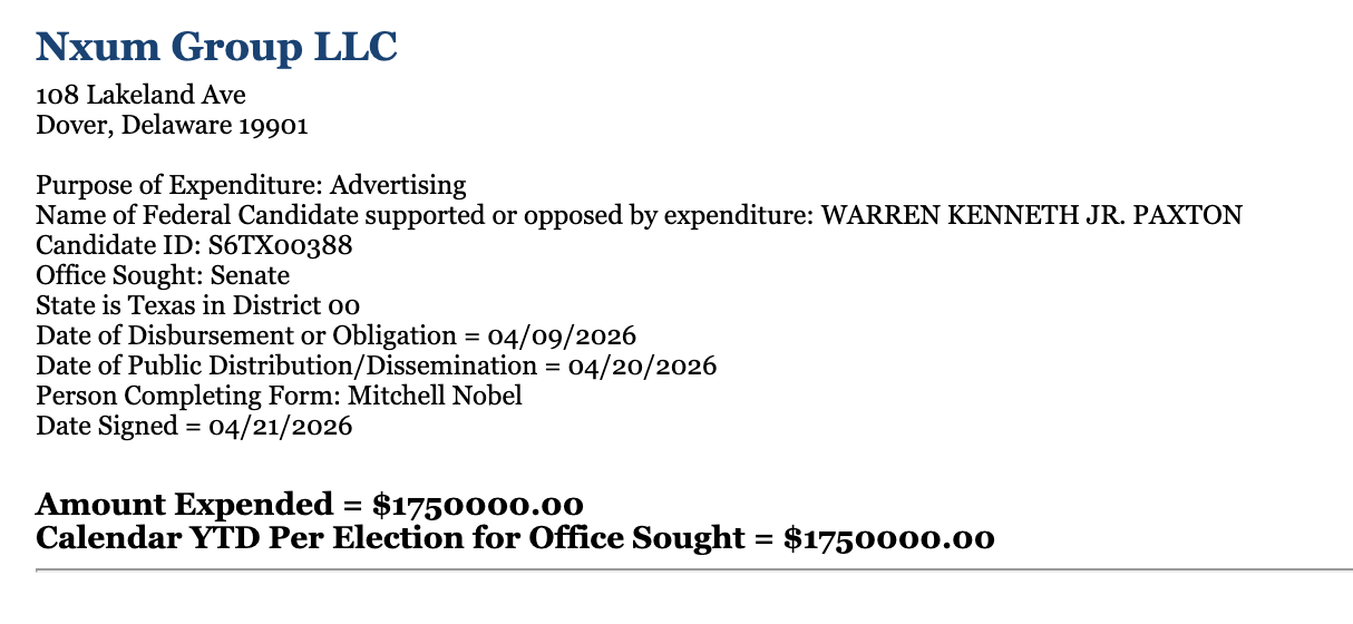 根据提交至联邦选举委员会的文件,该委员会在得克萨斯州为帕克斯顿支出175万美元,同时在佐治亚州、阿拉巴马州及路易斯安那州分别投入35万、35万和60万美元,支持多位共和党候选人。所有开支均由由前白宫加密顾问Bo Hines共同创立的Nxum Group执行。