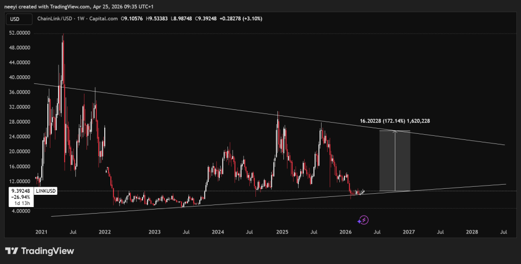 更乐观的情景下,若加密市场整体回暖,叠加开发者活跃度与企业采用率同步上升,下一个阻力位将指向25美元。该水平与周线图上自2021年起形成的楔形整理区域重合,具备显著的技术意义。