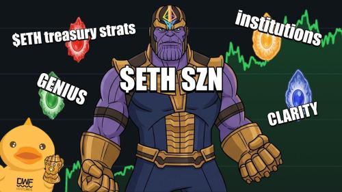 此外,DWF Ventures 还指出了其他推动 ETH 上涨的利好因素,例如《CLARITY 法案》。该法案减少了机构投资者获取 ETH 的限制,因为 ETH 被明确定义为商品而非证券。虽然《GENIUS 法案》主要聚焦于稳定币,但随着稳定币市值的增长,以太坊占据近 50% 的市场份额,这对 ETH 构成了重要利好。