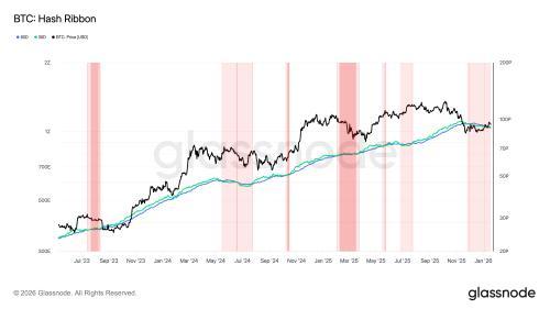 VanEck笔记显示,历史上,矿工持续承受压力的时期往往预示着比特币价格走势的复苏,因为效率低下的矿工会退出市场,抛售压力最终也会消退。哈希带状图表明,一旦算力30日移动平均线重新回到60日均线之上,最糟糕的抛售期可能即将结束,而这种形态通常与价格走势的改善相吻合。