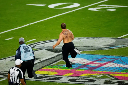 从他踏入场地到被安保扑倒,一共在场上奔跑了 30 秒。而超级碗官方 30 秒广告位的标价是 700 万美元。