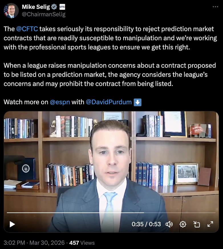 塞利格强调,联盟在评估赛事事件真实性和潜在干预风险方面具备独特优势,因此其立场将在决策中占据关键地位。此举标志着CFTC正逐步强化对预测市场的专属监管主张,与多州博彩监管机构形成政策张力。
