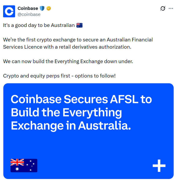 全球加密货币交易所Coinbase宣布,在成功取得澳大利亚金融服务牌照后,计划将业务范围扩展至期货、期权、股票交易、支付及其他传统金融产品,致力于构建覆盖多类资产的综合型交易平台。