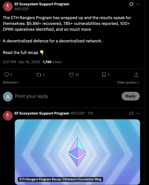 以太坊基金会对此次调查给予高度关注,显示该议题已进入主流安全议程。除发现朝鲜相关渗透外,“ETH Rangers”还成功追回或冻结超580万美元资金,识别超过785个安全漏洞,并处理多起事件响应。