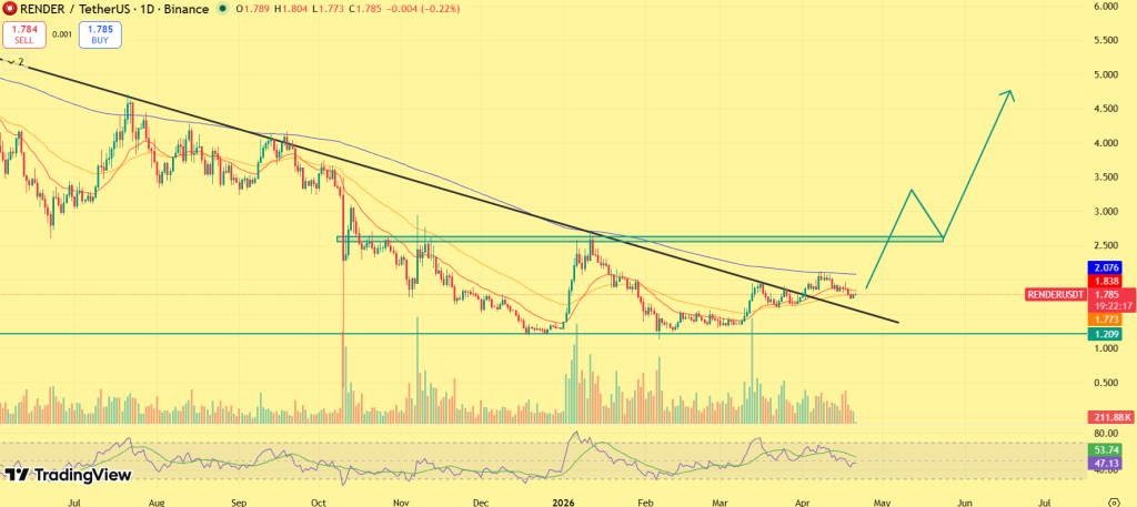 RNDR代币当前实时报价为1.79553375美元,正处于价值重估的临界点。若去中心化GPU计算在人工智能与数字内容产业中的渗透率持续提升,预计到2026年,其价格有望攀升至18美元区间。而更长远来看,随着全球对可扩展、低成本计算资源的需求不断增长,到2030年,该资产或触及100美元里程碑。