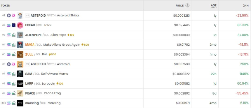 当前去中心化交易所中,ASTEROID(WETH)、FOFAR(SOL)与ALIENPEPE(SOL)成为市场关注焦点。截至24日数据,ASTEROID(WETH)报价为0.0003213美元,24小时内下跌23.99%;位列第二的FOFAR(SOL)涨幅达86.47%,价格升至0.00004419美元;第三名ALIENPEPE(SOL)上涨37.00%,现价为0.0001030美元。