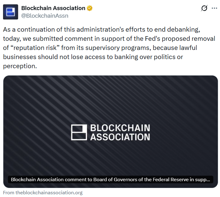 美国区块链协会公开支持美联储拟议的监管改革,主张将“声誉风险”因素从银行审查体系中永久移除。该机制曾被广泛用于切断加密货币企业的银行渠道,引发业界对其合规性被政治化操作的担忧。
