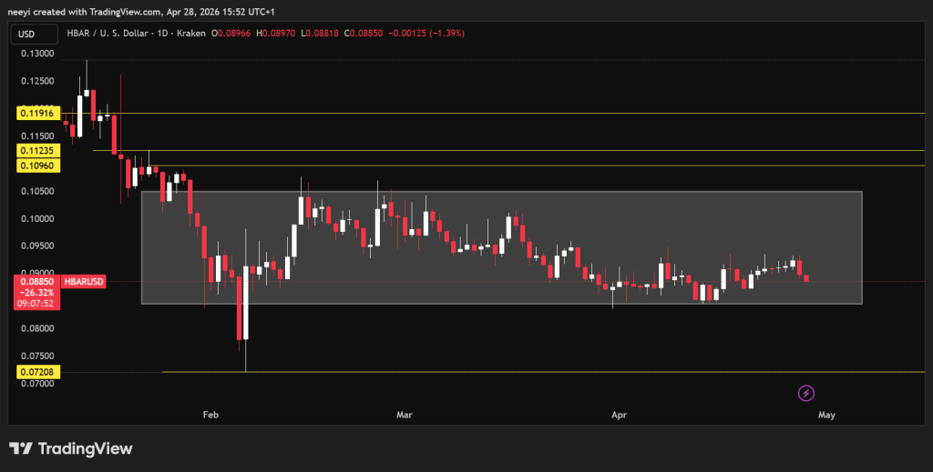 自今年二月以来,HBAR资产价格始终处于窄幅震荡状态,整体呈现轻微下行趋势。即便出现短暂反弹,也难以形成有效突破,令投资者感到失望。这种持续三个月的胶着格局引发关注:五月是否将成为扭转局面的契机?
