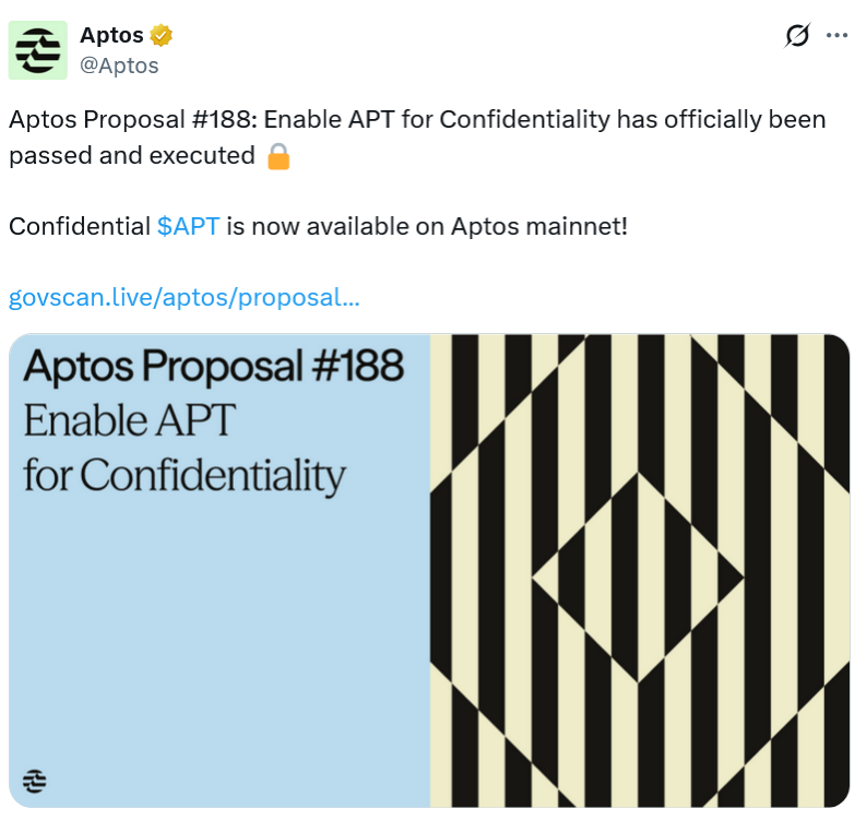 在治理提案近乎全票通过后,采用零知识证明机制的“Confidential APT”已于周五完成在Aptos主网的上线。该功能可在不暴露账户余额及交易金额的前提下,确保每笔交易仍具备可验证性,实现数据隐藏与信任机制的并行。