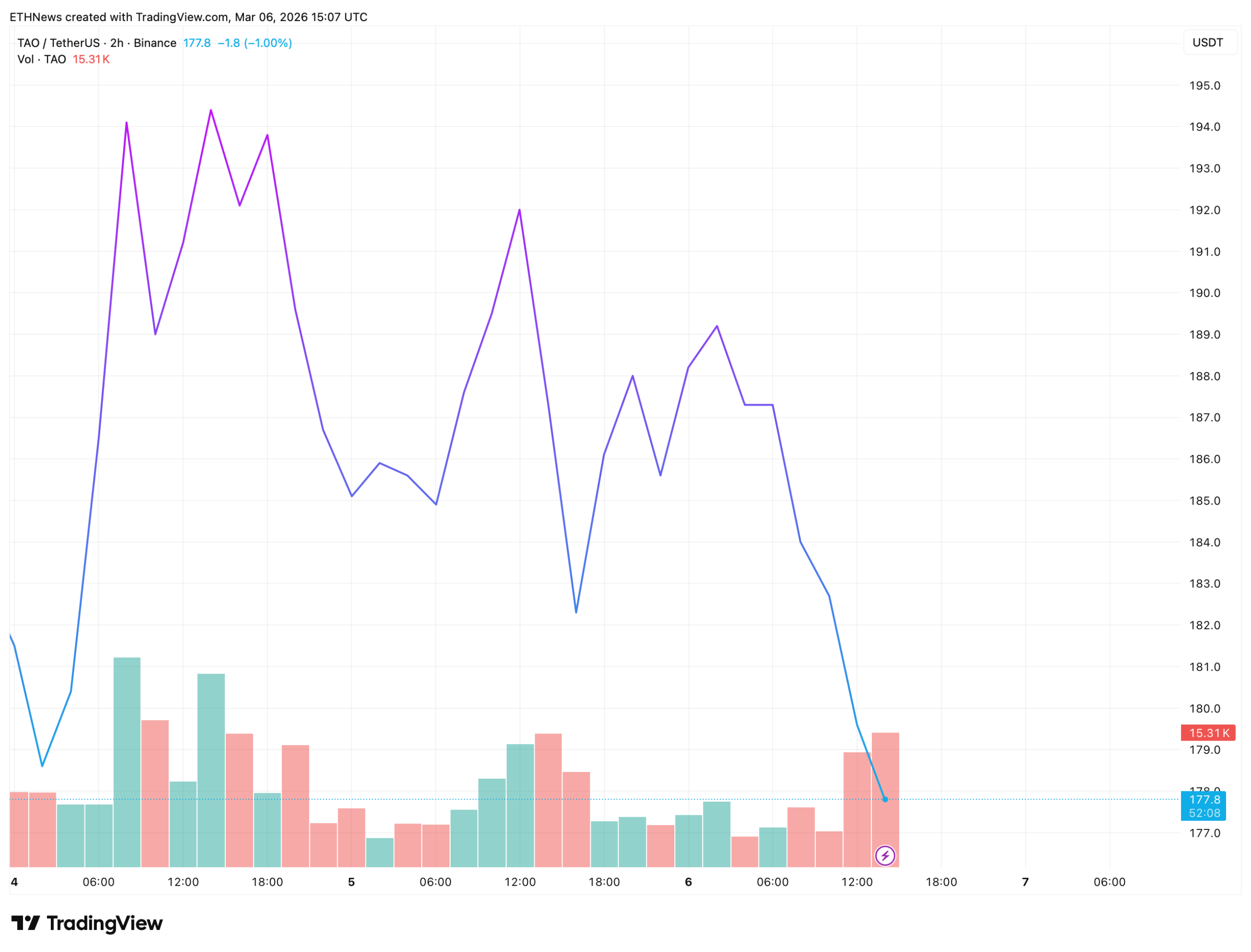 TAO代币在3月6日交易价为177美元,经历两日盘整后于小时内下跌1%。加密货币交易员GainMuse指出,当前价格位于下行趋势阻力下方,形成收窄三角形结构,此类形态通常预示即将出现显著方向性突破。 3月5日价格在185至192美元区间震荡,3月6日受非农数据引发的抛售压力影响,两小时内从187美元急跌至177.8美元。伴随该波动的成交量柱为近期最高,表明此次下跌由主动卖出驱动,而非流动性不足所致。 当前价位已回吐3月4日上涨的大部分成果。177至178美元区间能否构成有效支撑,成为决定后续走势的关键。长期结构暗示潜在下行风险